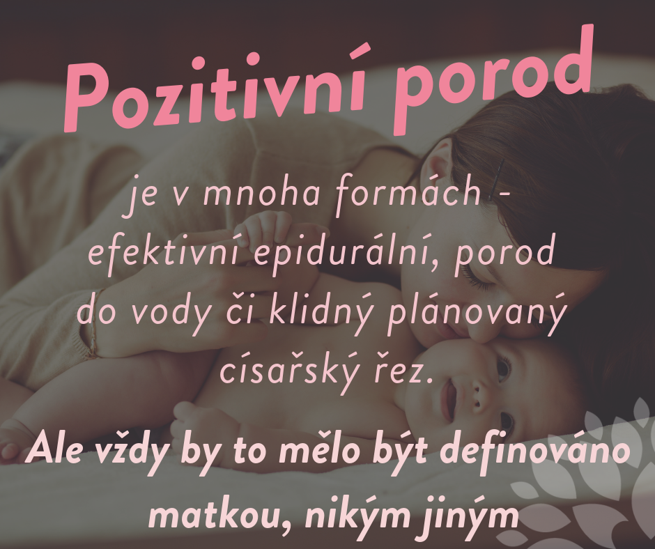 Je potřeba, aby každá žena věděla, že existují různé formy a podoby porodu. Existuje porod tichý, pohodlný, hlučný, řvavý, porod bezbolestný, orgasmický, porod bolestivý, vědomý, radostný, porod rychlý a dlouhý, porod bez léků a porod s léky, porod vyvolávaný a porod po termínu, porod císařským řezem a koncem pánevním.