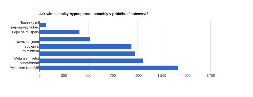 Doporučujeme těhotným ženám přijít na kurz hypnoporodní přípravy co nejdříve, aby měly dostatek času na nácvik hypnoporodních technik. 1 420 žen, které se zúčastnily našich kurzů a rozhodly se dotazník vyplnit, v dotazníku ocenilo, že byly před porodem klidnější, 1 060 těhotných získalo větší sebevědomí a 976 žen se dokázalo díky technikám hypnoporodu rychleji uvést do stavu vnitřního klidu. Výsledkem je, že pro 86,7 % ze všech dotázaných žen byl porod pozitivním zážitkem.
