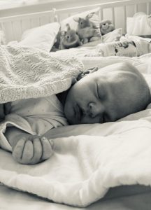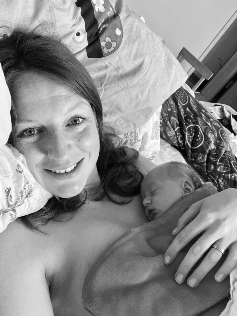 Sáhla jsem ještě na krček, jestli bude potřeba přetáhnout pupeční šňůra, ale nebylo. Trvalo to možná minutu, a s poslední vlnou vklouzla Liborovi do rukou jeho druhorozená maličká bohyně, kterou mi hned podal. Trošku si postěžovala, že je jí zima (tuhle místnost jsme na 25 stupňů prostě vytopenou neměli), takže jsme pozhasínali světla, a přesunuli se do vyhřáté postele. Položila jsem si to své štěstí na bříško, odkud se před minutkou vynořila, a ona se sama zbavovala zbytků plodové vody.