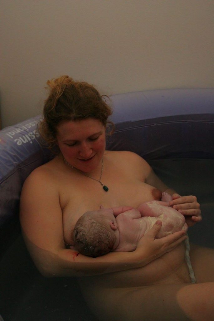 Přikryli jsme tě červeným ručníkem, ale ten rychle navlhnul, takže jsem cítila potřebu okamžitě vylézt z bazénku, aby ti nebyla zima. To co jsem si před porodem představovala jako nemožné – jak se po porodu vyškrábu na souš, jsem najednou udělala velmi razantně a plná sil asi tak tři minuty po porodu 😀 Sedla jsem si na gauč a užívali jsme si nerušeného bondingu. Krásně jsi se plazil k prsu, odrážel ses nožičkama, „kloval“ hlavičkou, jak jsi hledal prso. Přiznám se, že jsem ti trochu pomohla, protože při velikosti mých prsou, bys musel být netopýr, kdybys chtěl zvládnout samopřisátí 😀 Vůbec nevím za jak dlouho se PA zeptala, jak to vidím s placentou, řekla jsem, že bych to mohla zkusit, ale potřebuji do stejné polohy, ve které jsem rodila. Tys byl ještě na pupečníku, takže jsme si tě s tatínkem trošku složitě podávali pod mou nohou, pak jsem si klekla a porodila placentu. Krásnou, živelnou. Máme její fotku. Pak teprve tatínek přestřihl pupeční šňůru. Takže na malý okamžik jsi vlastně byl tzv. „lotosové dítě“. Pak jsem se zvedla a šla se úplně v pohodě osprchovat. Sedla jsem si ve sprše na sedátko a cítila se tak silná, že už zvládnu všechno na světě. Protože jsem právě takhle krásně porodila dítě!
